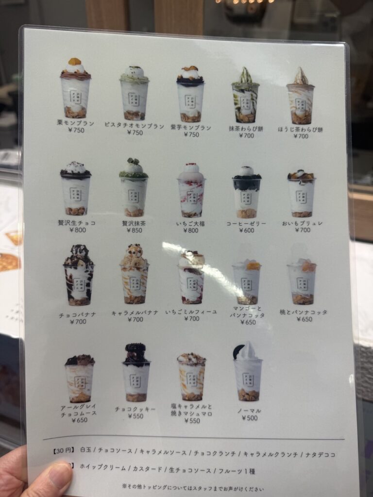 アイスの種類は20種類ほど。季節限定のメニューもあります。価格は500円から。白玉やナタデココ、チョコソースやカスタードなどお好みのトッピングを追加することもできます。