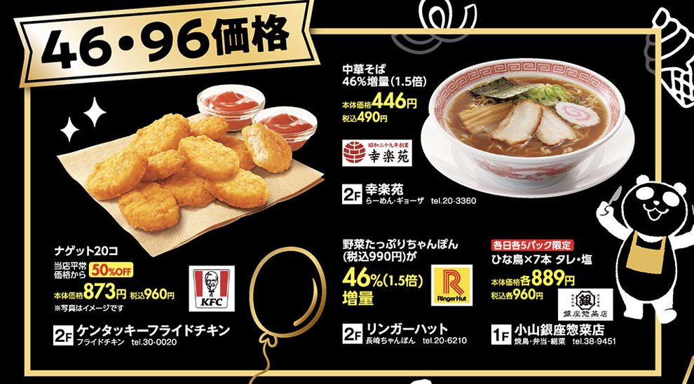 46・96価格として、ケンタッキーのナゲット20個が50%オフで税込み960円、後楽園の中華そばやリンガーハットの野菜たっぷりちゃんぽんが46%増量(1.5倍)、小山銀座惣菜店の焼き鳥7本セットが960円(税込)なども登場。