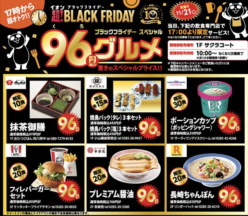 イオンモール小山のブラックフライデーがアツい!おトクとイベントが盛りだくさん・96円グルメも・11月20日〜30日|小山市