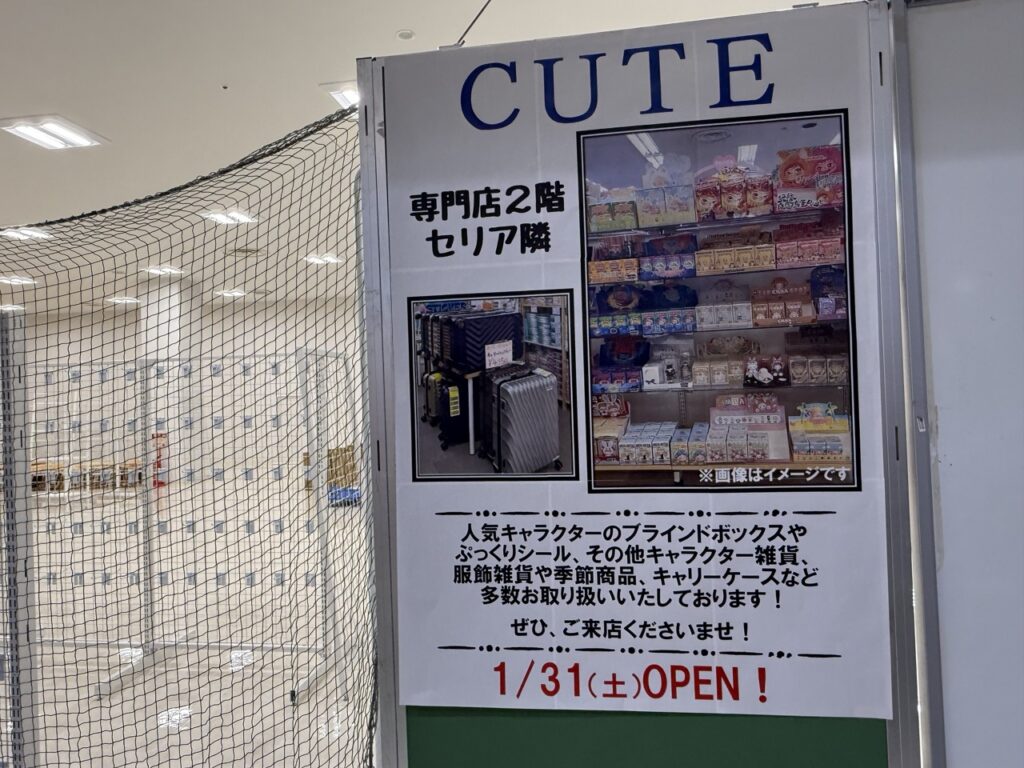 イオンモール小山の専門店2階、セリアの隣に期間限定のショップ「CUTE」が2026年1月31日(土)にオープンします。