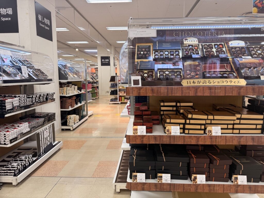 イオンモール小山のチョコレート売り場は食料品売場の隣(化粧品売場側)。売り場の面積はかなり広く、ずらりと並ぶバレンタイン商品は圧巻です。(これがバレンタインが近くなると売り切れて棚はスカスカになってしまうのだからすごい!)