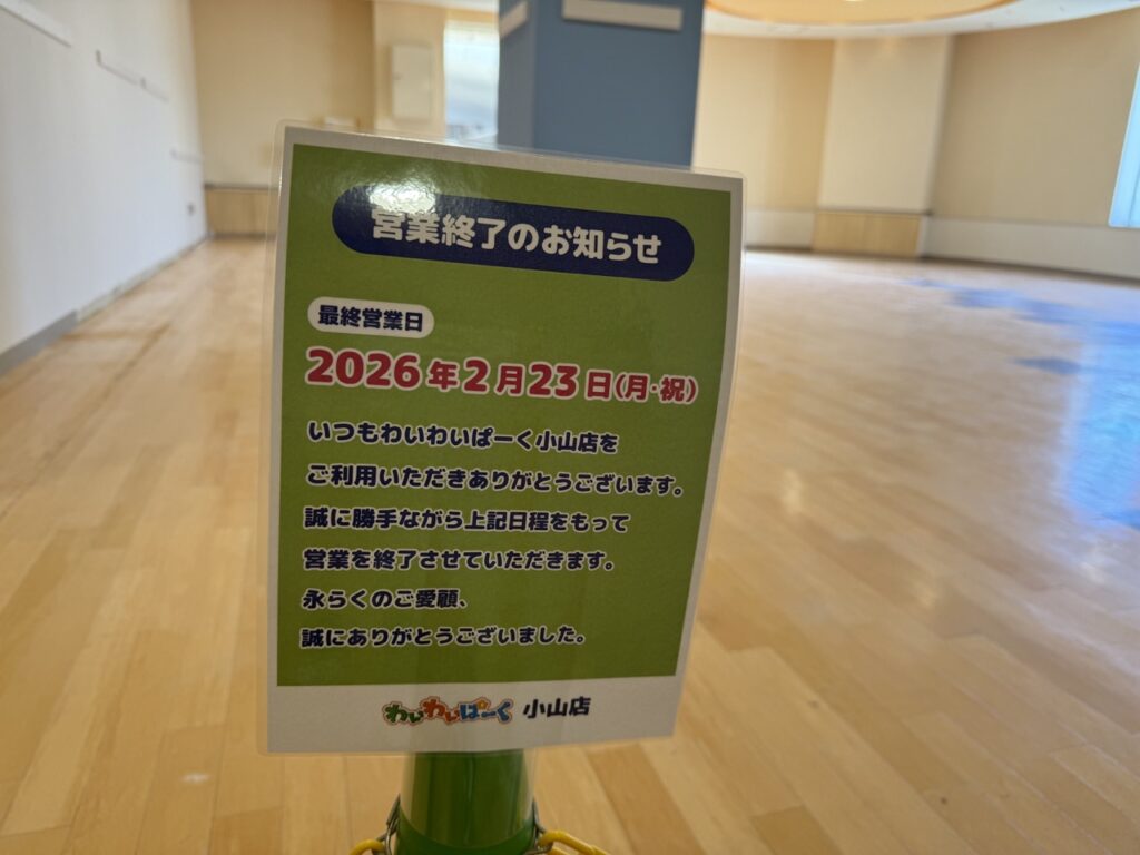 栃木県小山市にあるイオンモール小山の小さな子どもの遊び場「わいわいパーク 小山店」が2026年2月23日をもって閉店していました。わいわいパークがあったのは、フードコートの隣のスペース。