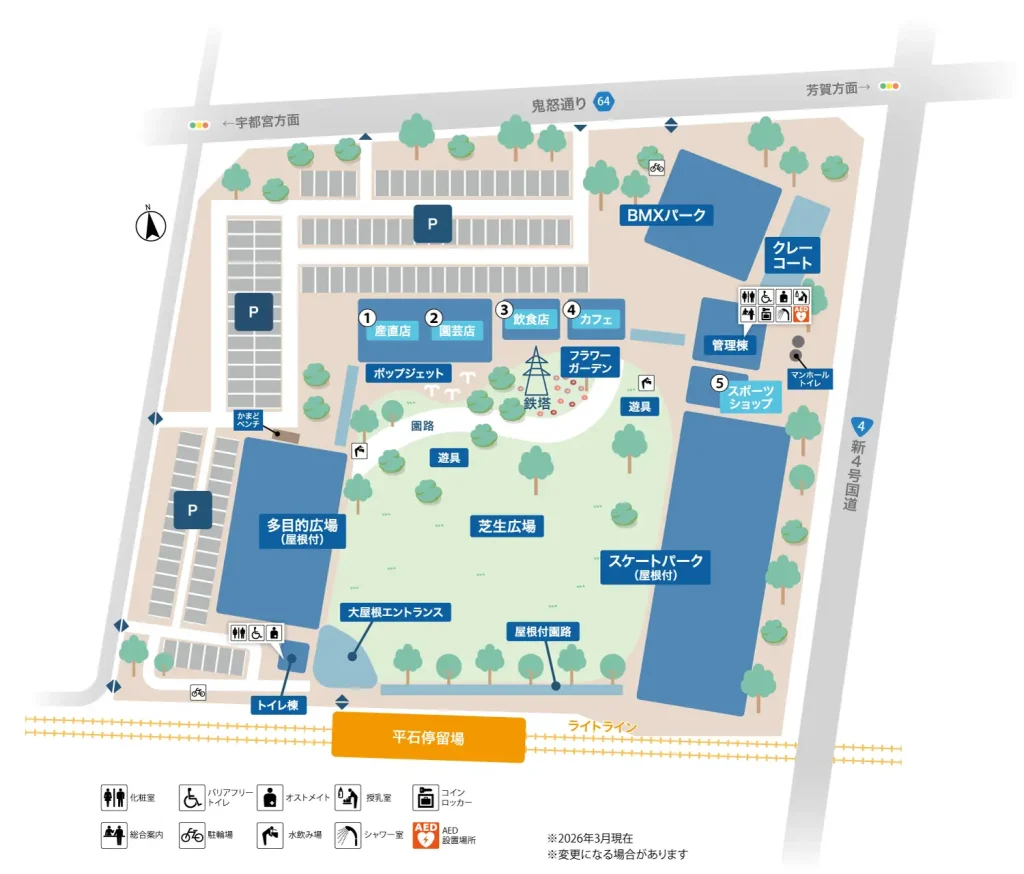 - 施設概要:スケートパーク、BMXパーク、多目的広場、スポーツ用品店、産直店、園芸店、飲食店、管理棟