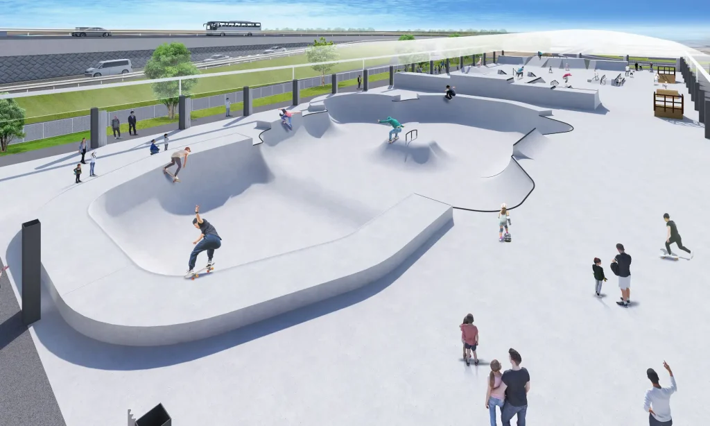国内最大級のスケートパークが登場。屋根付き。初心者から上級者まで対応し、全国大会なども見込める仕様のスケートパークです。