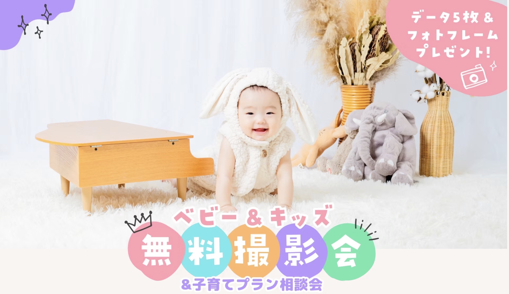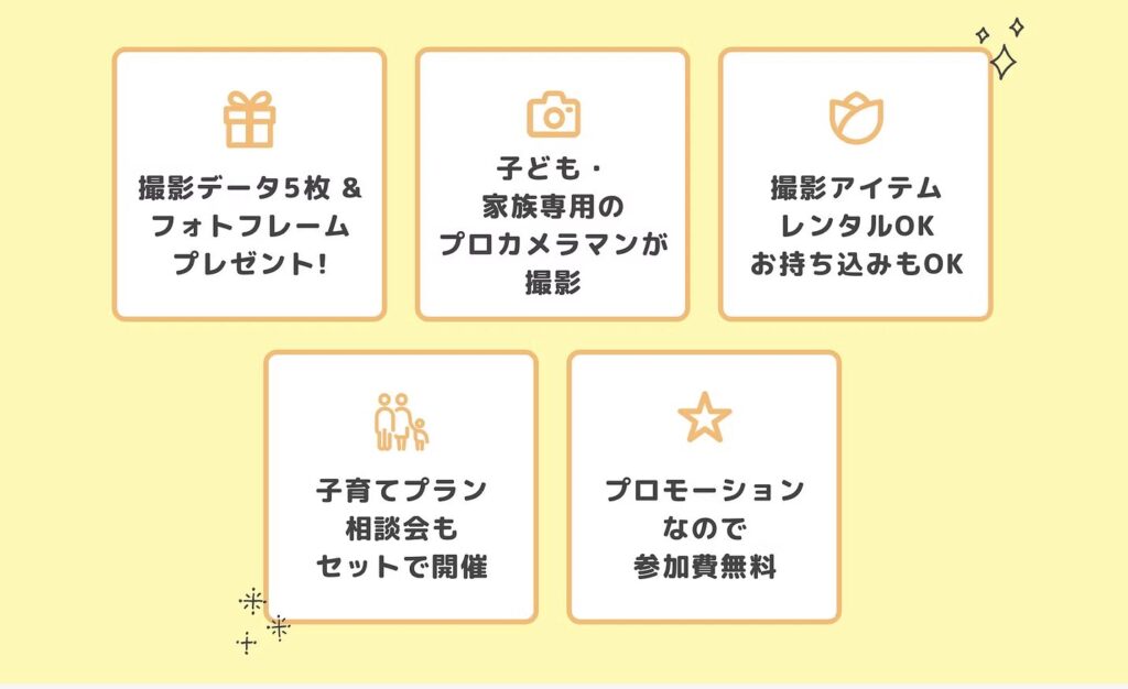 - 参加者特典:撮影データ5枚プレゼント &「子育てプラン相談会」で後日の個別相談をご予約された方に「フォトフレーム」プレゼント