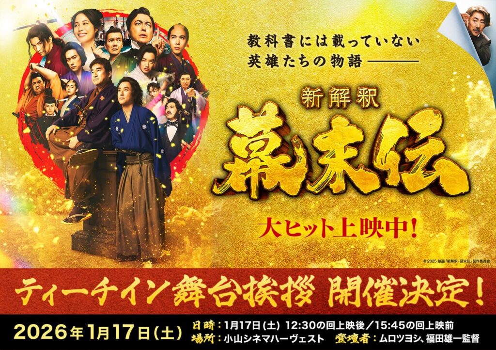 映画「幕末伝」の大ヒットを記念して、ムロツヨシさんと福田雄一監督によるティーチイン舞台挨拶の実施が決定しました。小山シネマハーヴェストにて2026年1月17日の12時半の回、15時45分の回に実施。