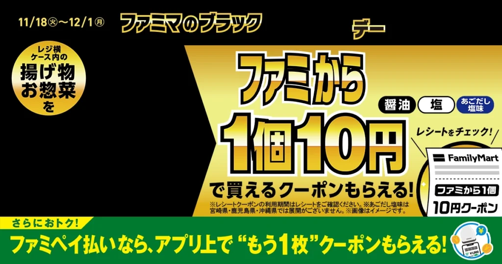 - 内容:レジ横ケース内の揚げ物・お惣菜を2個買うと「ファミからが1個10円で買える」クーポンもらえる!