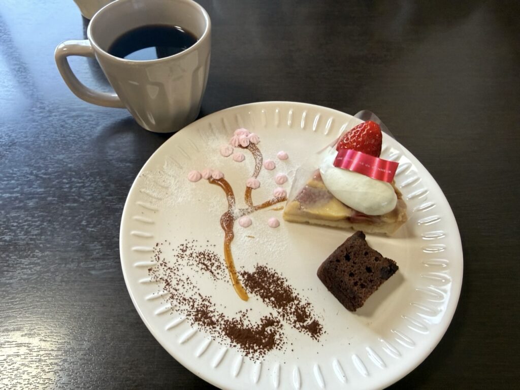プレートに描かれた花木が美しい!イートインならではのサービス、嬉しいです。クラフィティはもちっとした食感が好きで美味しくいただきました。