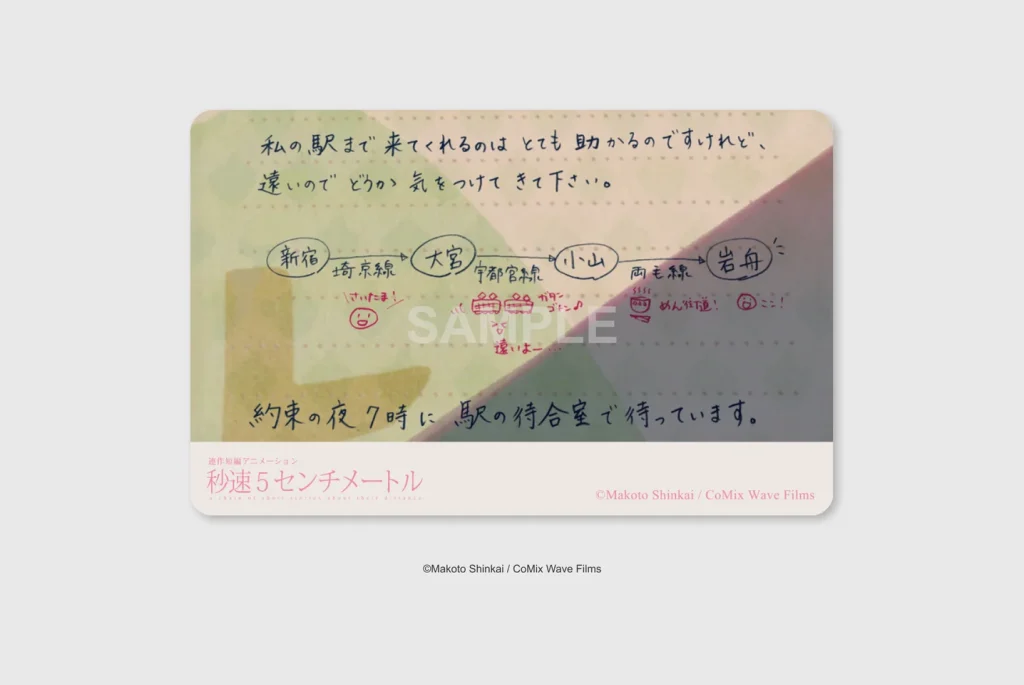 ムビチケは、劇中で明里から貴樹へ送られた手紙がモチーフとなっており、明里によって綴られた言葉と転校先である栃木県・岩舟駅までの電車の乗り換えメモが書かれたデザイン。