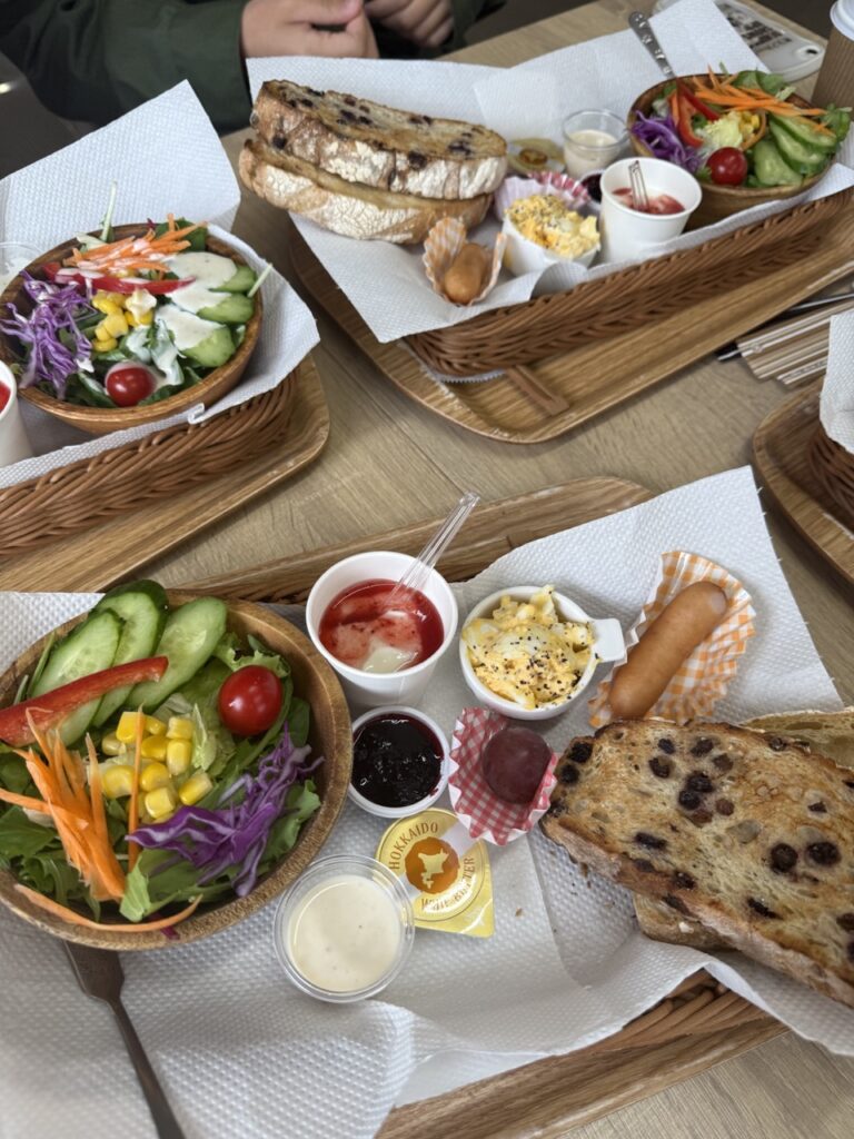 新鮮な野菜がたっぷりのサラダに手作りのジャム。たまごサラダ、ウインナー、フルーツにはぶどう。パンは道の駅でも販売されている市貝町の人気店「ブーランジェリーアンジュール」のもの。パンは焼いてあり温かくカリッとしています。