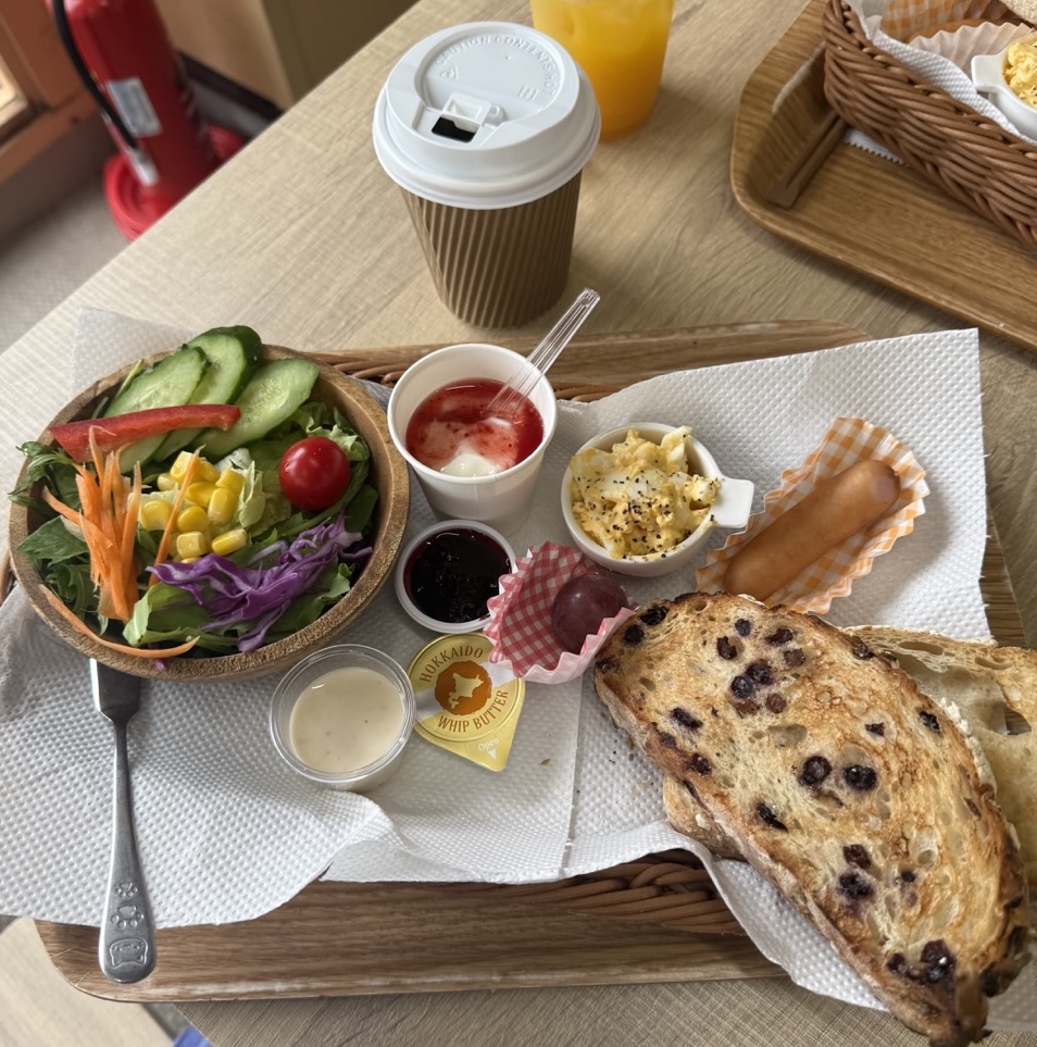 パンは山ぶどう、ソフトフランス、コンビ(山ぶどう&ソフトフランス)、パン・ド・ミの4種類から選べます。パンはコンビ(山ぶどう&ソフトフランス)、ドリンクはコーヒーを選びました。