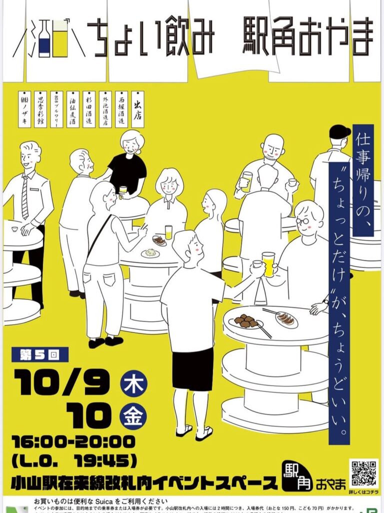 昨年も開催して大好評だった「ちょい飲み駅角おやま」が今年も開催! ちょい飲み駅角おやまでは、小山駅の改札内にあるイベントスペースにて、仕事帰りにふらっと立ち寄って地元のお酒が楽しめる空間が登場します。