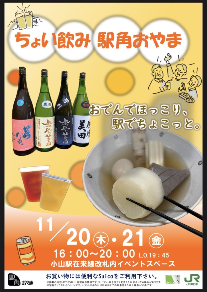 毎回大好評の「ちょい飲み駅角おやま」が2025年11月20日・21日に開催されます。ちょい飲み駅角おやまは、小山駅の改札内のイベントスペースを利用し、仕事帰りなどにふらりと立ち寄り、お酒を楽しむことができるイベント。※改札内のスペースで開催されるので、小山駅の入場券(おとな150円、こども70円)が必要です