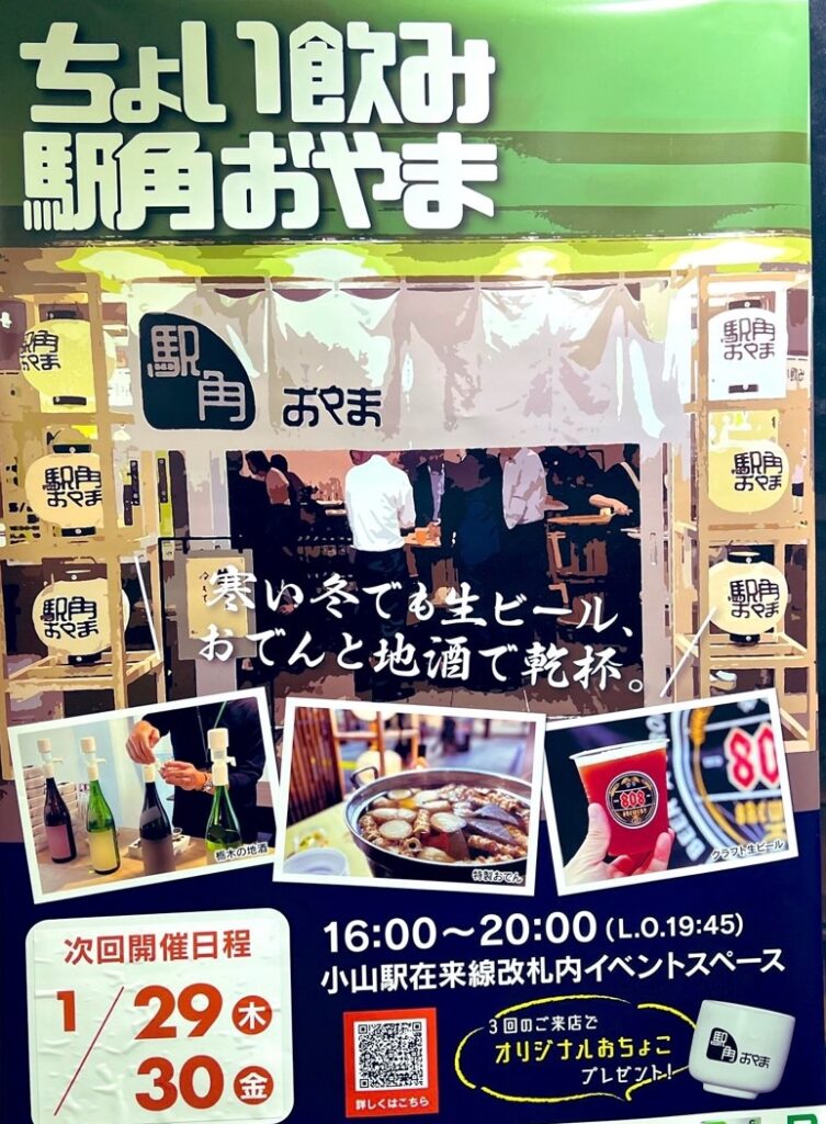 毎回大好評の「ちょい飲み駅角おやま」が2026年も開催されます。開催日は、1月29日・30日、2月26日・27日、3月26・27日。