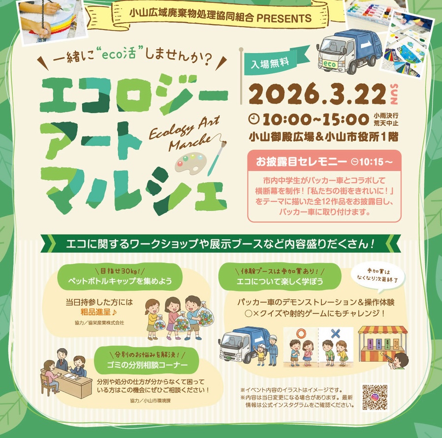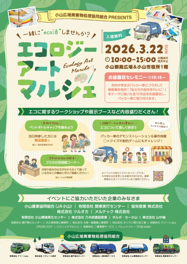 小山市でエコをテーマにした体験型イベント「エコロジーアートマルシェ」が2026年3月22日(日)に開催されます。会場は小山御殿広場と小山市役所1階。