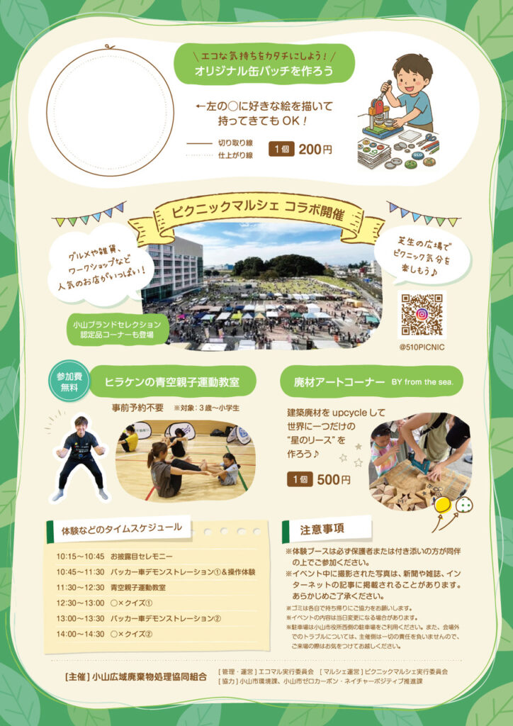 - 内容:エコをテーマにした体験型イベント、体験や展示、ワークショップなど。ピクニックマルシェとコラボし、グルメやハンドメイドも大集合。