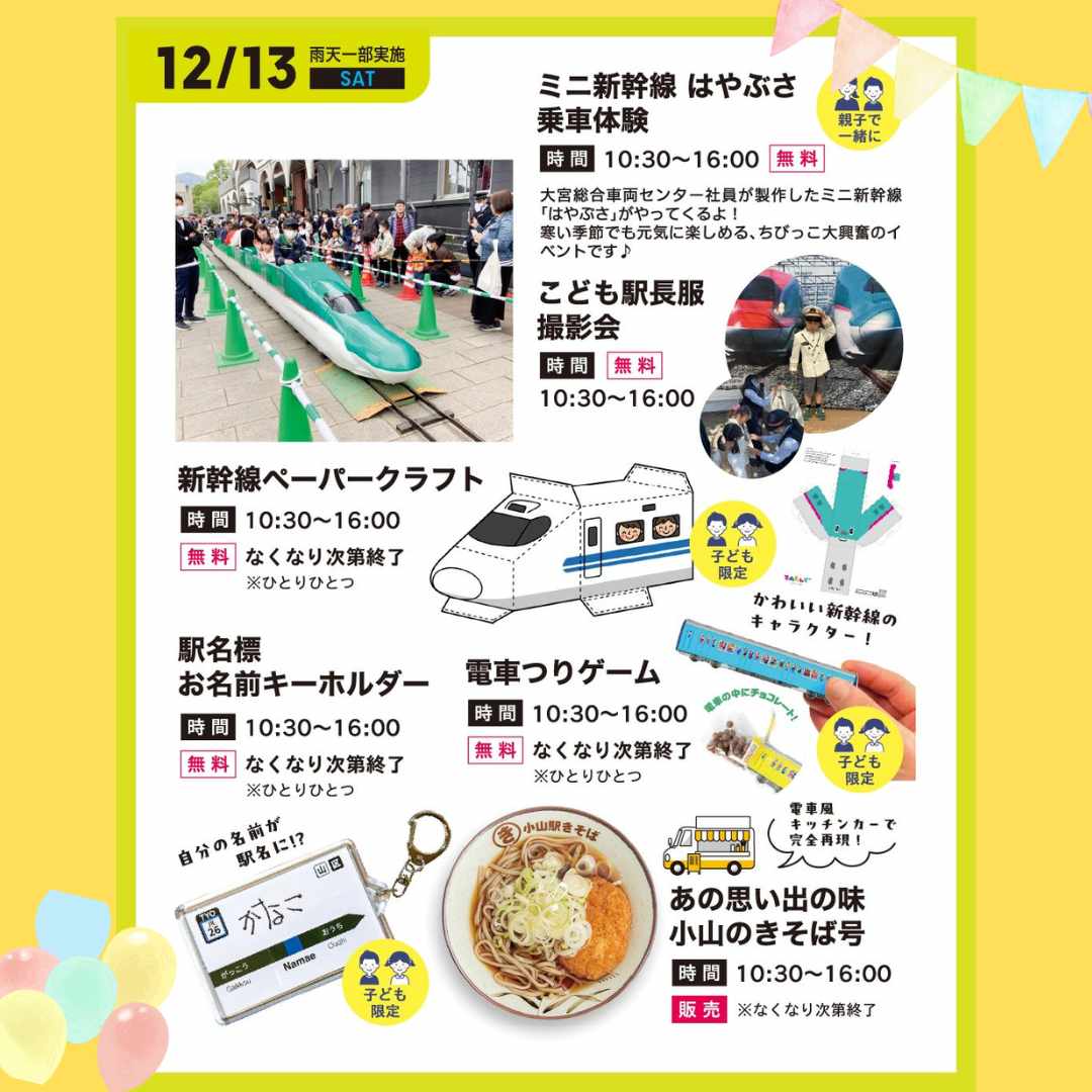 ミニ新幹線 はやぶさ乗車体験やこども駅長制服撮影会、駅名標 おなまえキーホルダーづくり。電車釣りゲームなど。さらにあの思い出の味 おやまのきそば号も出店します。きそが号では、いつもの食券が新幹線切符となり、駅弁のお茶容器でドリンク各種を提供予定です。