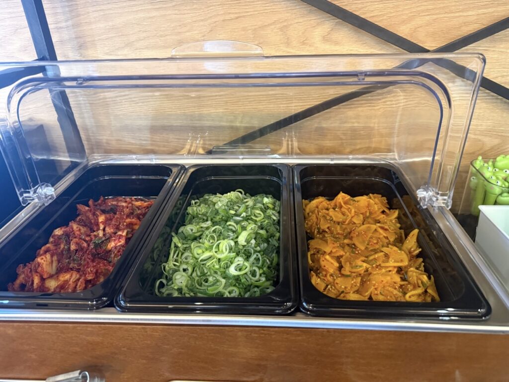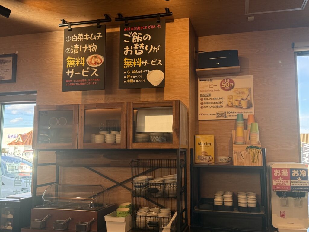 嬉しいことに、白菜キムチや漬物、ご飯のお替り無料サービスもあり。