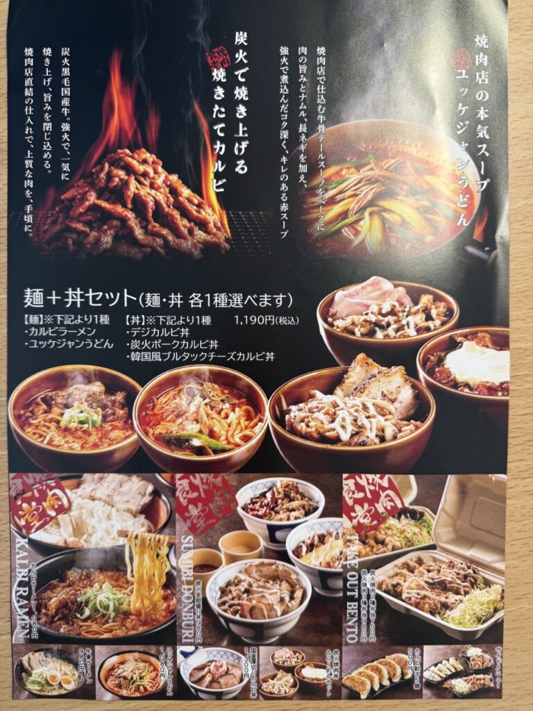 主なメニューは、名物のカルビらーめんや牛骨らーめんなどや丼ぶり、定食など。麺と丼のセットもあります。テイクアウトメニューもあり。