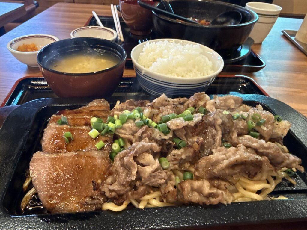 黒毛国産牛と豚ジャンポンが贅沢にアツアツな鉄板に並んでいます。ご飯がすすむ!