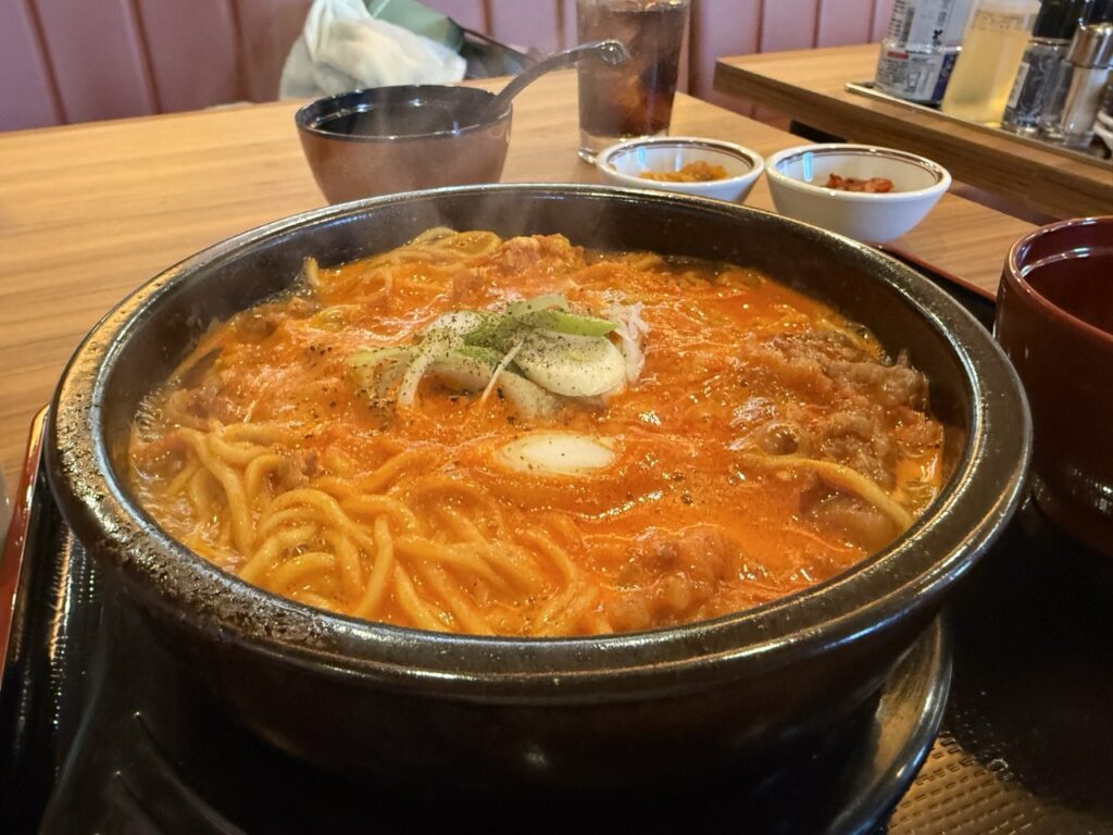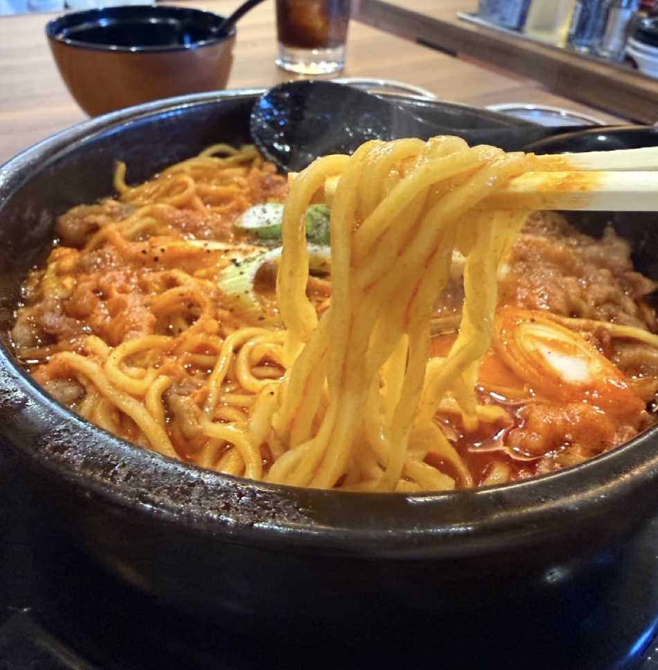 グツグツと煮立って運ばれてきました!食欲をそそる見た目に匂い!取り分け用のお椀がついてくるので、とりわけながらいただきます。辛いのが得意ではないので、辛さは普通にしました。普通の辛さは、辛いのが苦手な人でも大丈夫です。