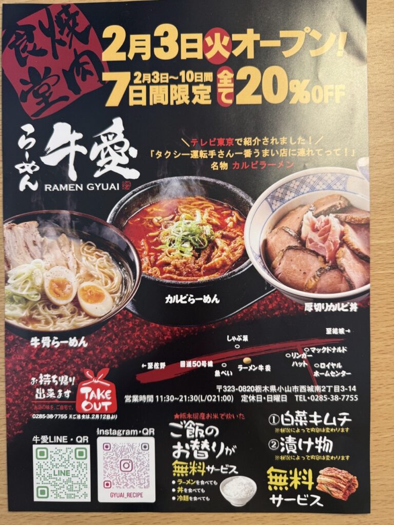 小山市の城南にある人気焼肉屋「牛愛」のラーメン店が2026年2月オープンします!