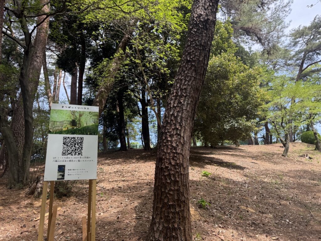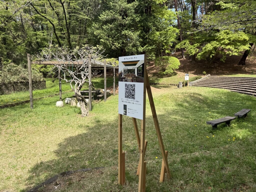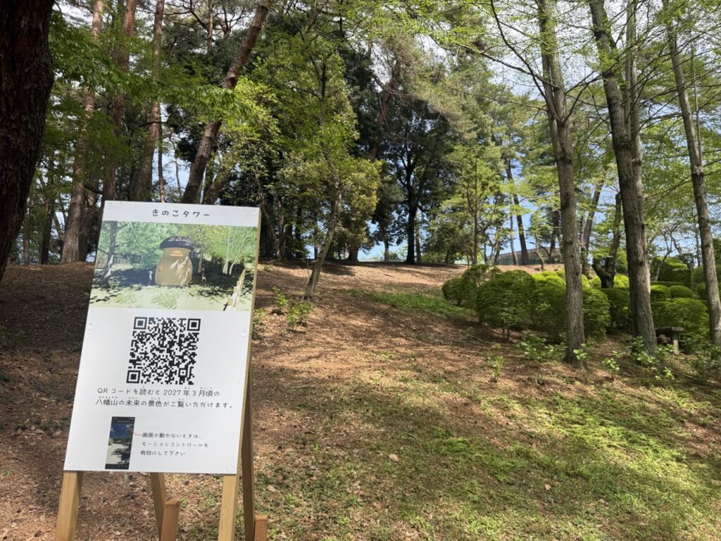 また、カフェやツリーハウスができる場所にはそれぞれ看板があり、QRコードを読み込むとスマホで完成予定の景色を見ることができます。