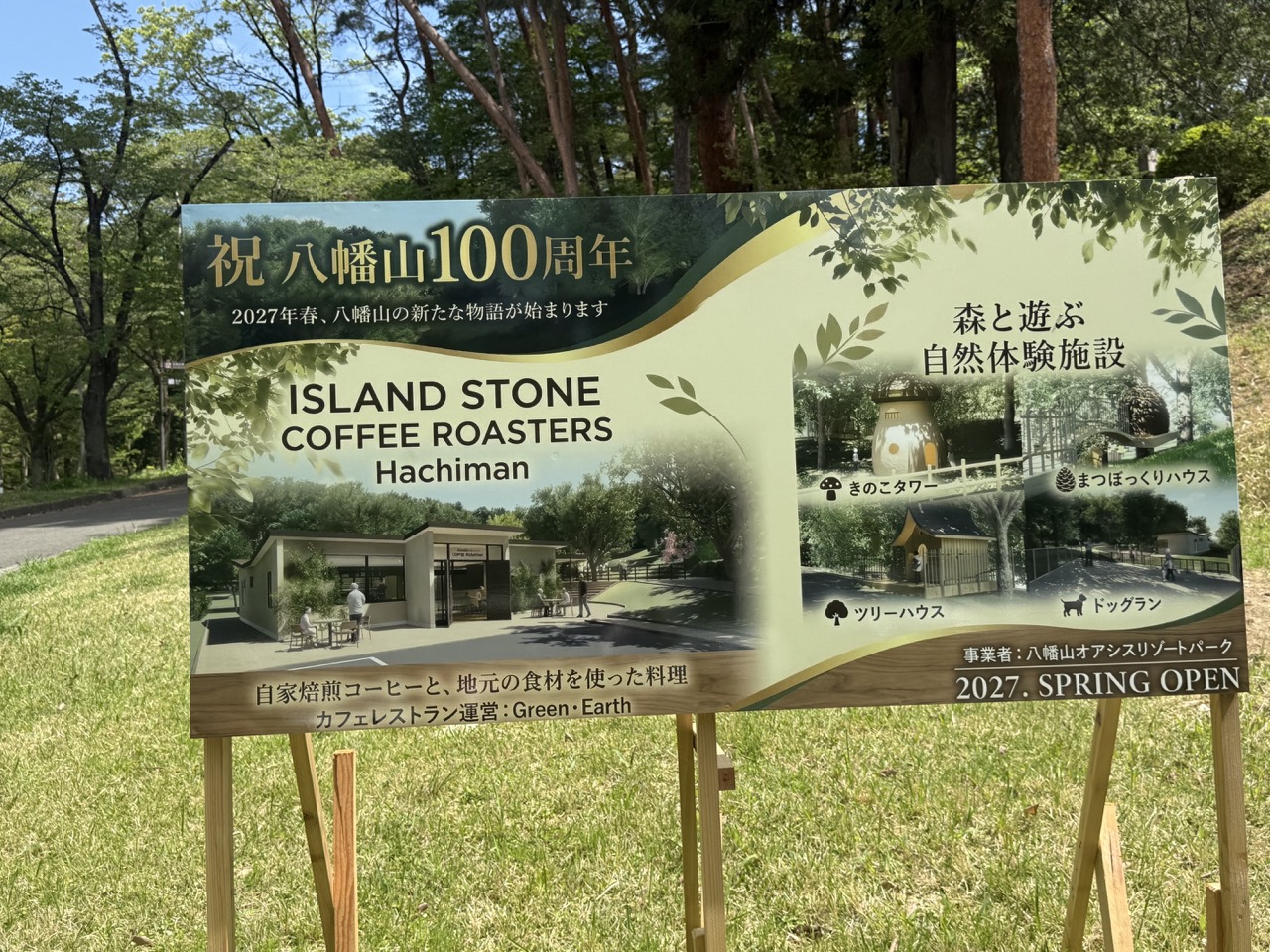 カフェやツリーハウスなどができる場所は、八幡山公園の西駐車場の近く。看板が設置されていました。