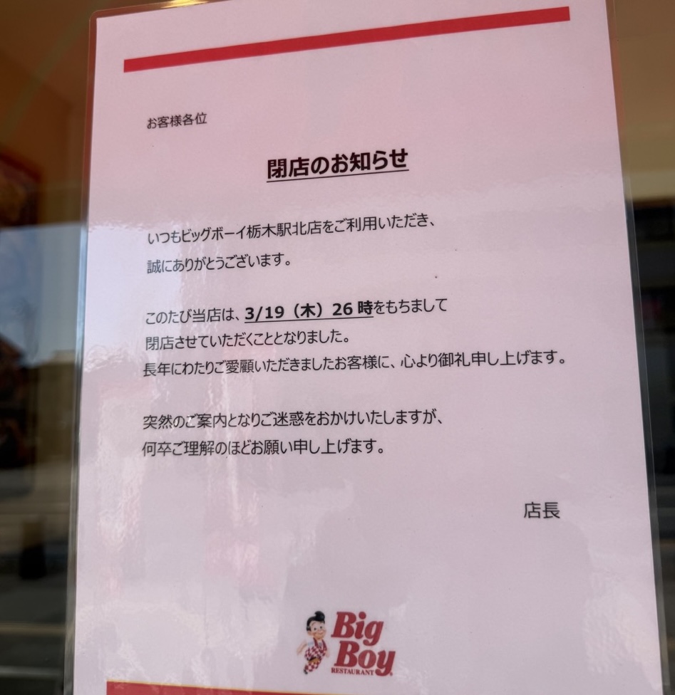 - ビッグボーイ 栃木駅前店 2026年3月19日(木)で閉店