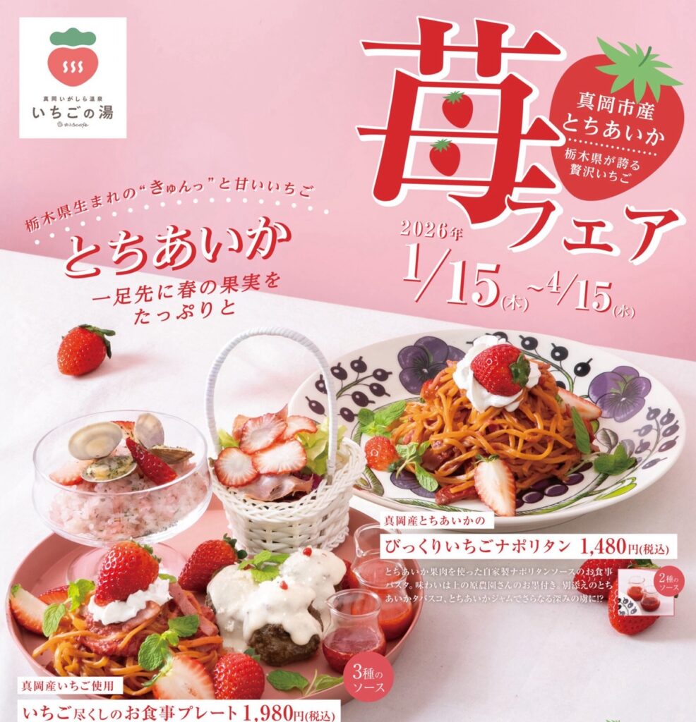 栃木県真岡市にある真岡いがしら温泉 おふろcafé いちごの湯。いちごの湯の中にあるレストラン「農家レストラン とちもおか」では、2026年1月15日から4月15日までの期間限定で苺フェアを開催中です。