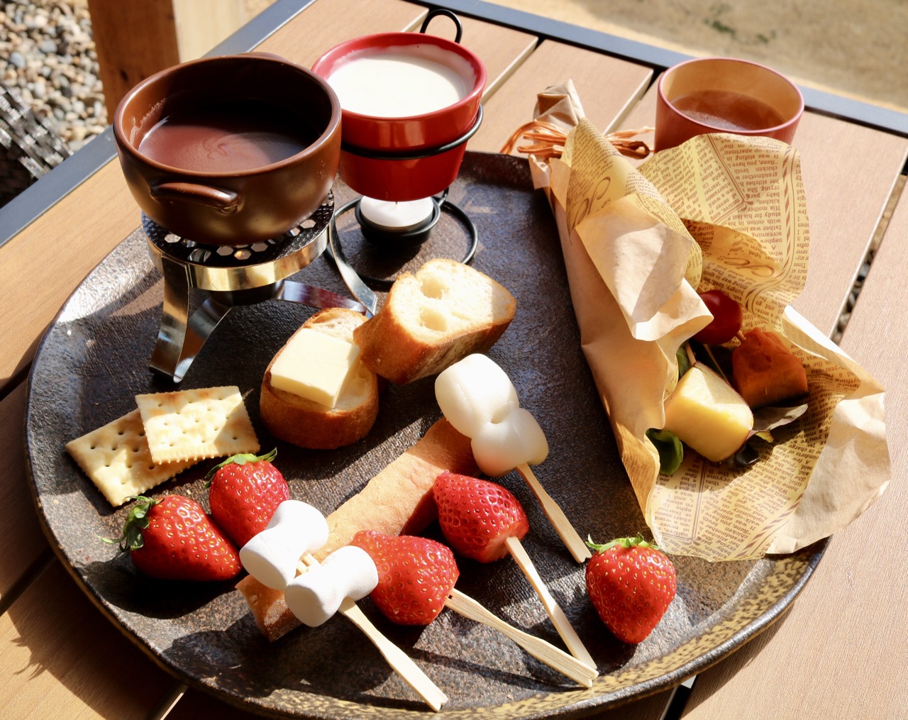 さらに、2025年から登場した「苺と旬野菜のチーズ&あんフォンデュ」も。苺やだんごなどをあんことチーズのWフォンデュでいただく一品。旬野菜やパン、スープ付きなのでランチとしてもおすすめ。数量限定です。