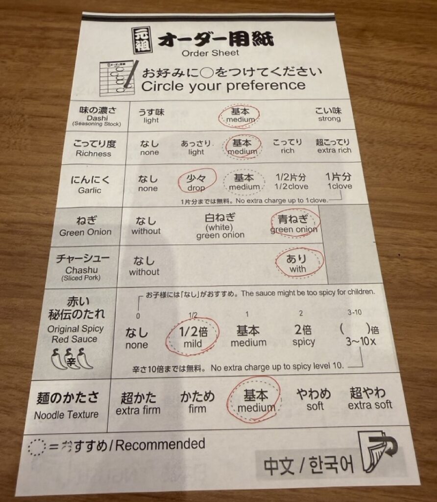 席についたら、次はオーダー用紙に味の濃さなどのお好みを記入します。(初めてで悩んでもおすすめが選べば安心)