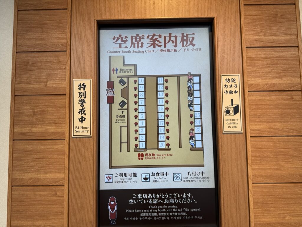 県を購入したら、空席案内板を確認し、空いている席を選んで座ります。表示を見ると直感的にどこが空いているのか一目でわかります。