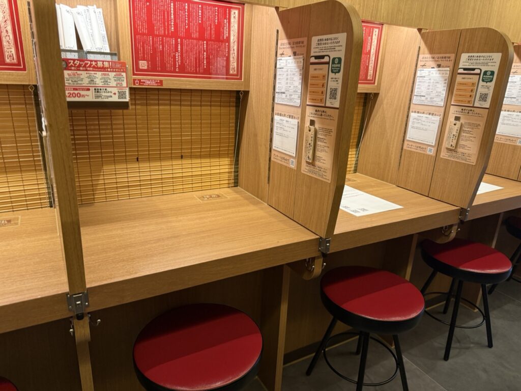 席はカウンター席のみ。隣の席と仕切りがあり、周りの目線が一切気にならないだけでなく、従業員とお客さんが直接顔を合わせることがないスタイル。一蘭の「味集中システム」と呼ばれるものです。