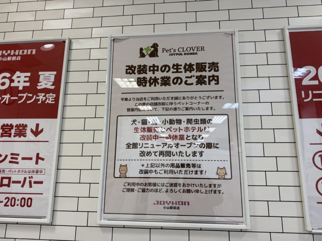 小山駅東口前にある「ジョイホン小山駅前店」は、2026年1月中旬から、ジャパンミートとペットショップをのぞいて休業しています。現在、リニューアルオープンに向けて工事中です。