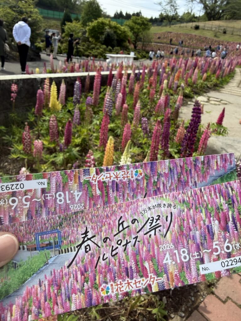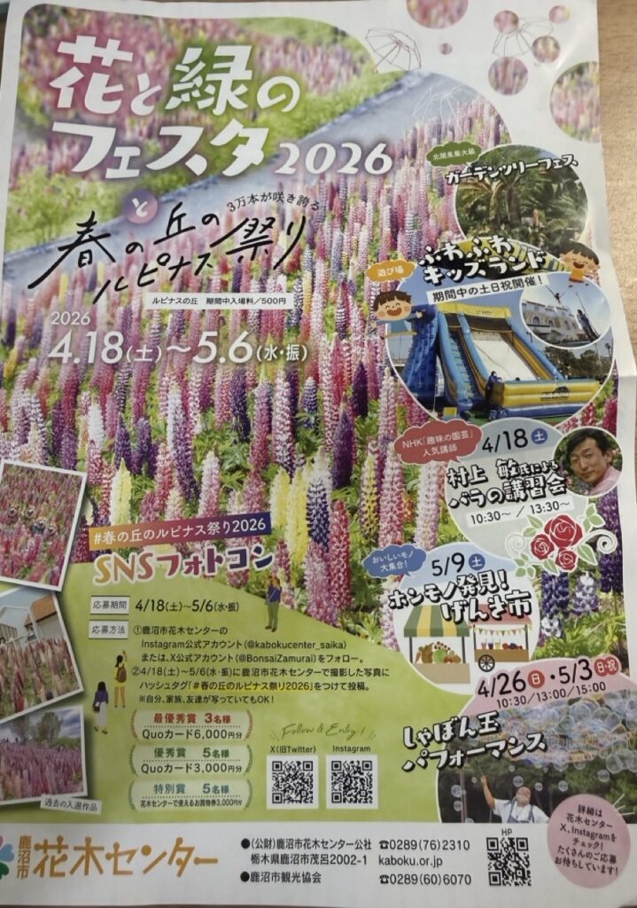 鹿沼市にある鹿沼市花木センターでは毎年4月中旬から5月上旬に「春の丘のルピナス祭り」が開催されます。2026年は、開花が早く期間を前倒しで当初の予定(4月18日)より早い日程の4月14日から開催されています。