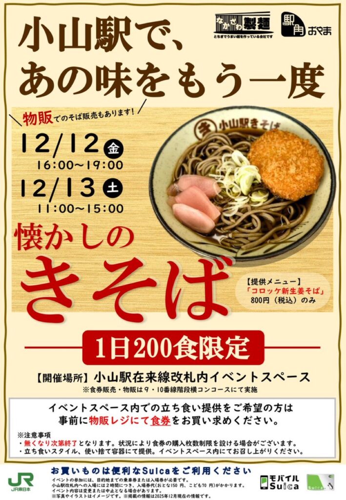 小山駅きそばが2日間限定で小山駅構内で復活します!