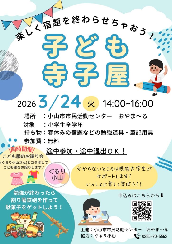 春休みの宿題を終わらせてしまおう!2026年3月24日(火)に小学生対象の「子ども寺子屋」が小山市市民活動センター おやま~るにて開催されます。