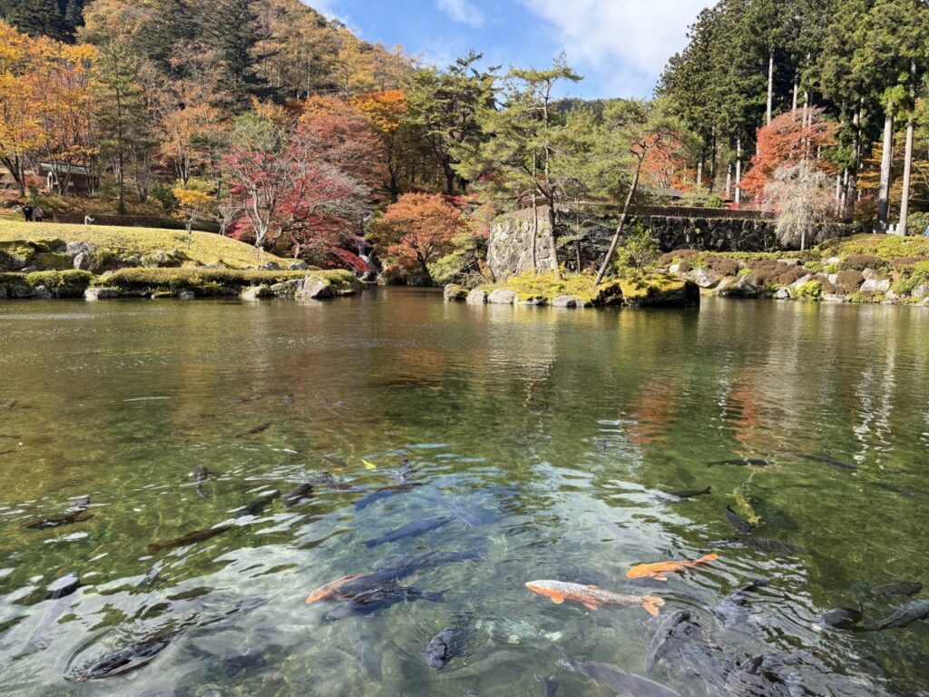 池の周囲を赤や黄色の紅葉が彩り美しい景色が広がっています。