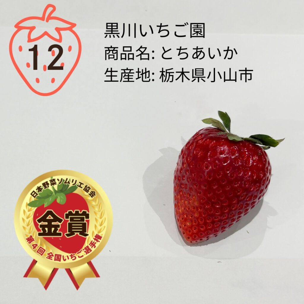 審査の結果、「第4回 全国いちご選手権」の最高金賞は栃木県真岡市『とちあいか』まりちゃんちのいちご畑。第1回目より埼玉県が3連覇となっていましたが、ついに4回目にしていちご王国栃木県のとちあいかが日本一へ。さらに、「黒川いちご園」のとちあいかは金賞を受賞しました。(金賞は、最高金賞につぐ賞で、全432品中6品のみの受賞です)