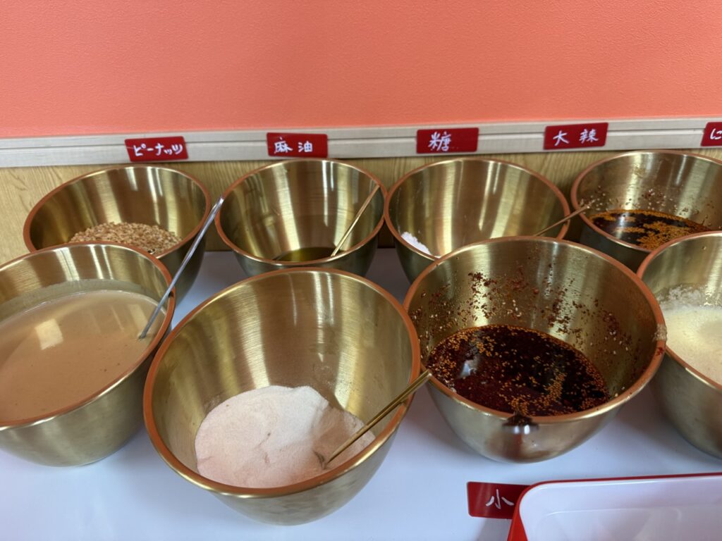 ▽自由にトッピングできる調味料。ピーナッツが好きです。