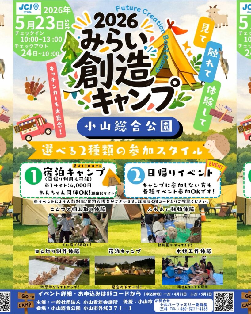 小山市の身近な公園でキャンプができる!今年もみらい創造キャンプが小山総合公園で開催されます。日程は、2026年5月23日〜24日。参加には申込みが必要で、1サイト(8名まで)で参加費は4,000円です。限定10サイトで、ペットと一緒に宿泊できるサイトも登場。