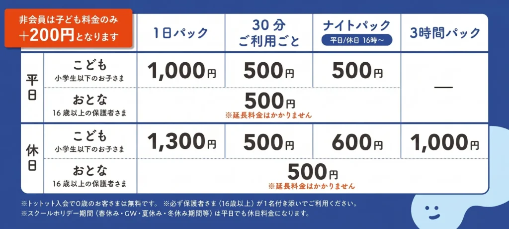| 休日 | おとな(16歳以上の保護者) | 500円 ※延長料金はかかりません | |||