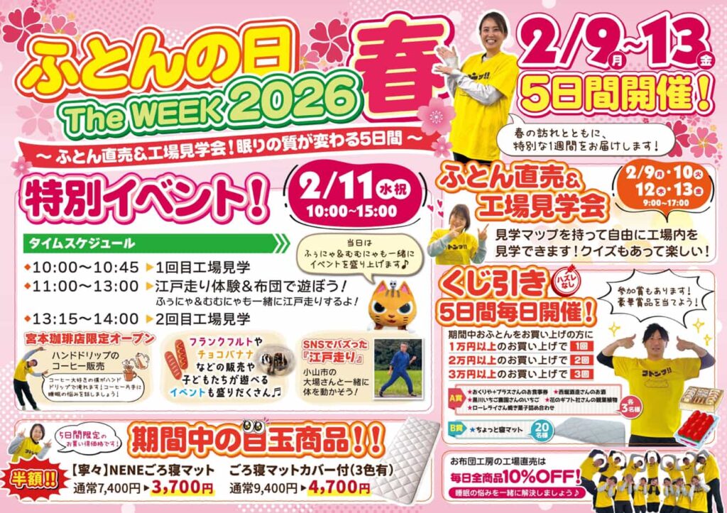 小山市にある「お布団工房」でイベント「ふとんの日 The WEEK 2026春」が2026年2月9日から13日まで開催されます。