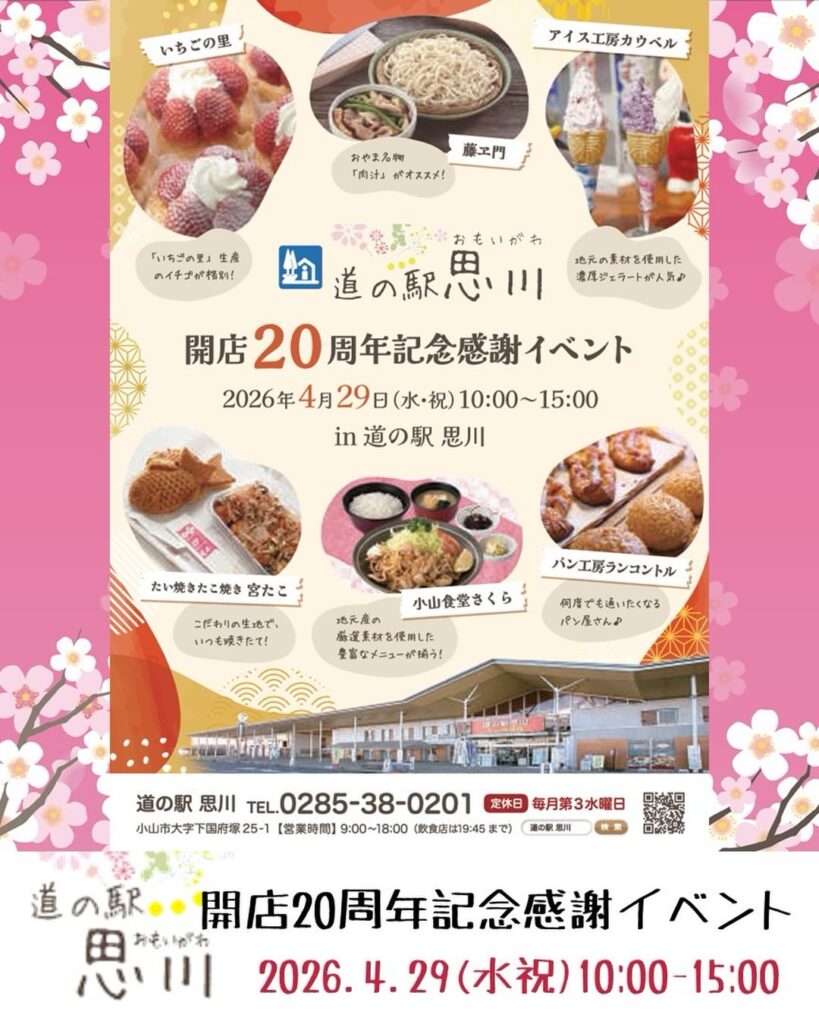 道の駅思川で「開店20周年記念感謝イベント」が開催!2026年4月29日(水・祝)の1日限定で、ステージイベントや30店舗以上のマルシェなど、盛りだくさん。さらに、ふわふわや縁日ブース、ミニ列車乗車体験など子どもが楽しめるコンテンツも開催予定です。