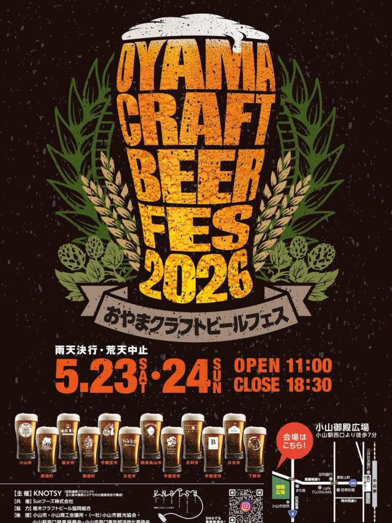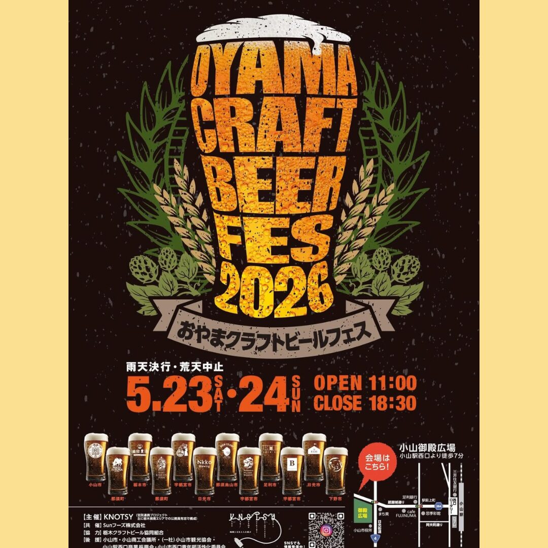 クラフトビールを楽しめるイベント「おやまクラフトビールフェス2026」が、2026年5月23日(土)・24日(日)の2日間にわたって小山市で開催されます。場所は小山市役所隣りの小山御殿広場にて。