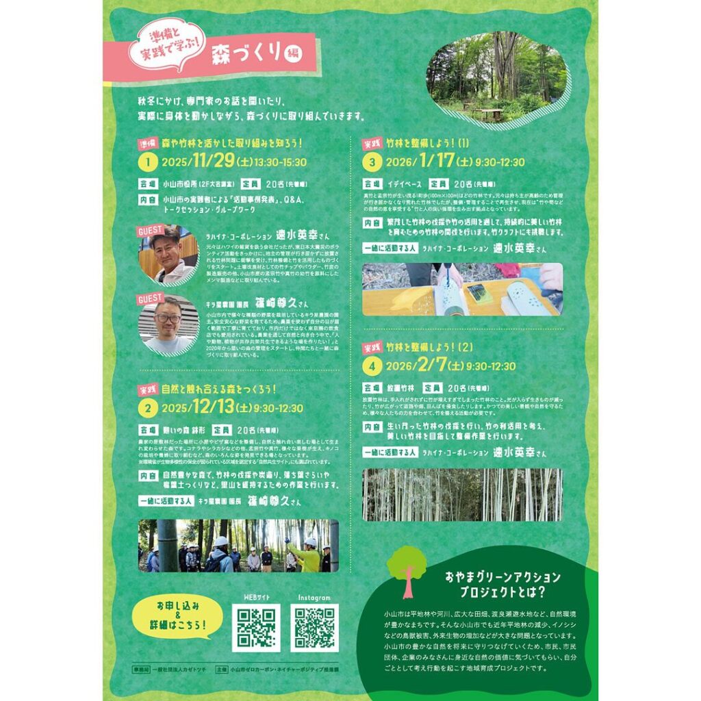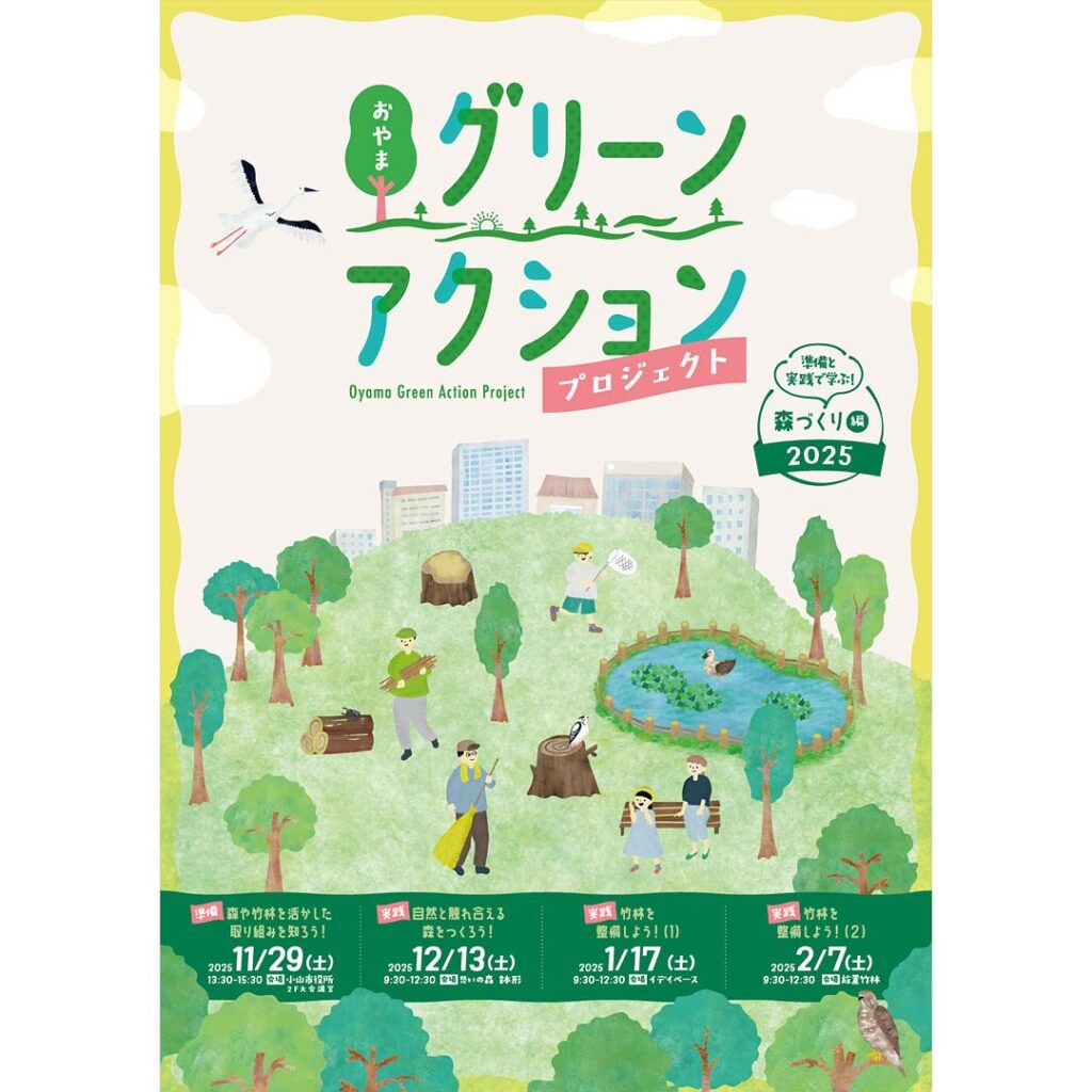 おやまグリーンアクションプロジェクトでは、2025年11月から2026年2月までの秋冬にかけて「準備と実践で学ぶ!森づくり編」を開催します。専門家のお話を聞いたり、実際に身体を動かしながら、森づくりに取り組んでいきます。