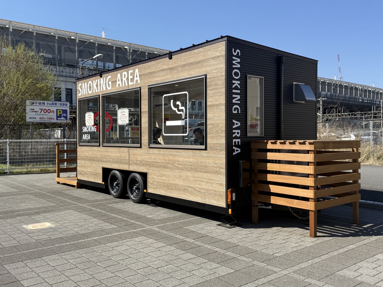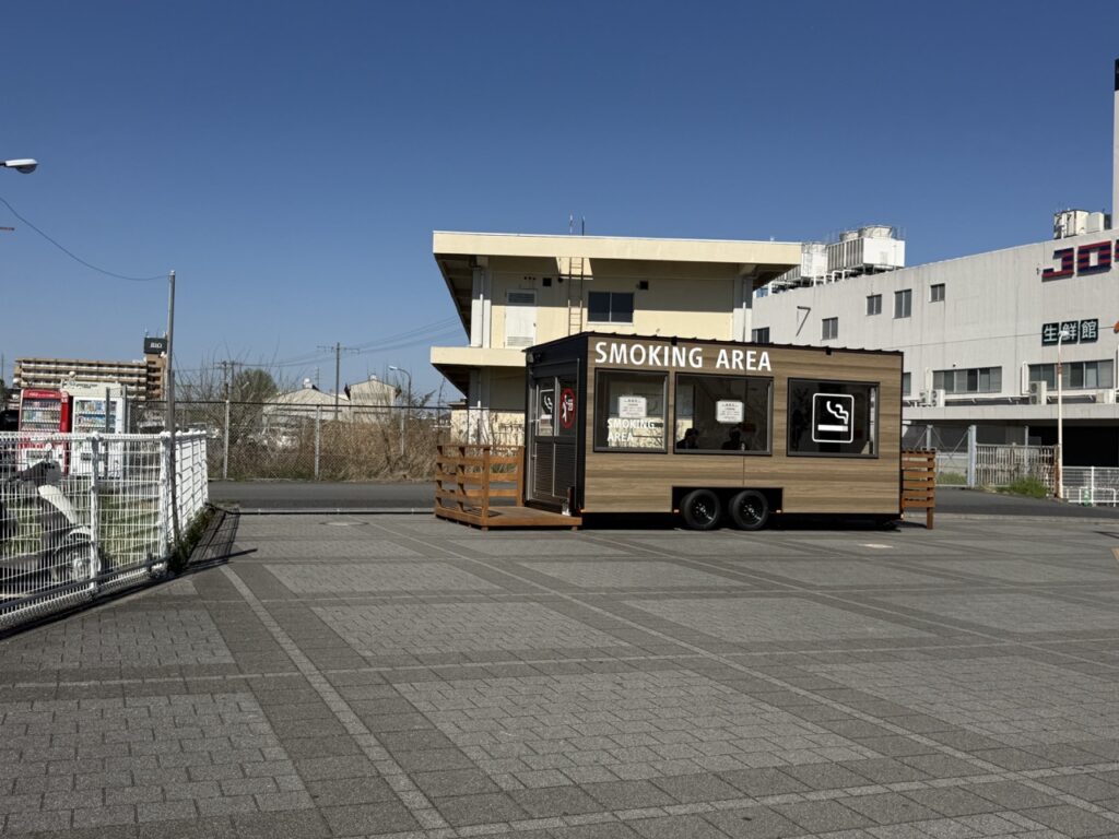 西口にあった喫煙所は路上にあったため近くを通ると匂いが気になりましたが、東口に新たに設置された喫煙所はトレーラー型で、受動喫煙や匂いに配所した設計となっています。この歩道は、駐車場やジャパンミート方面へ歩く人も多い通りなので、トレーラーハウスの喫煙所はありがたいですね。見た目もスタイリッシュで景観にも配慮されているように感じます。