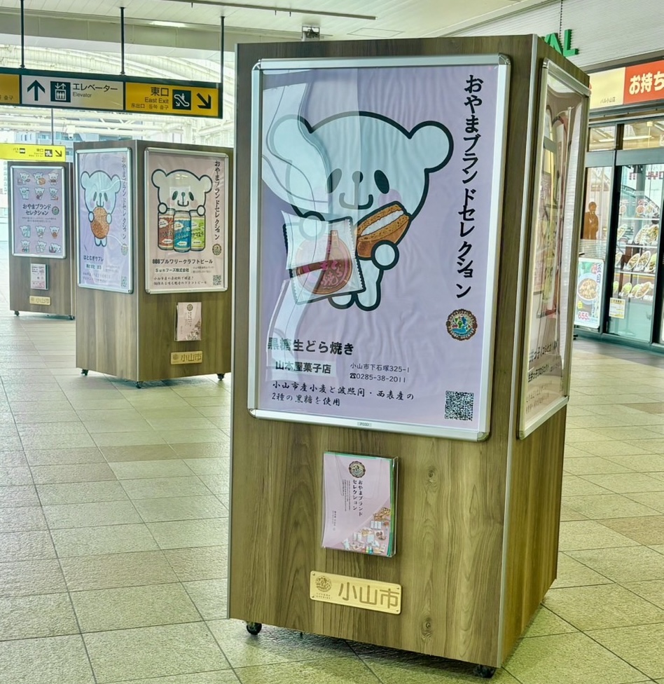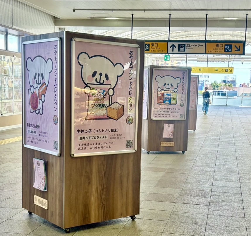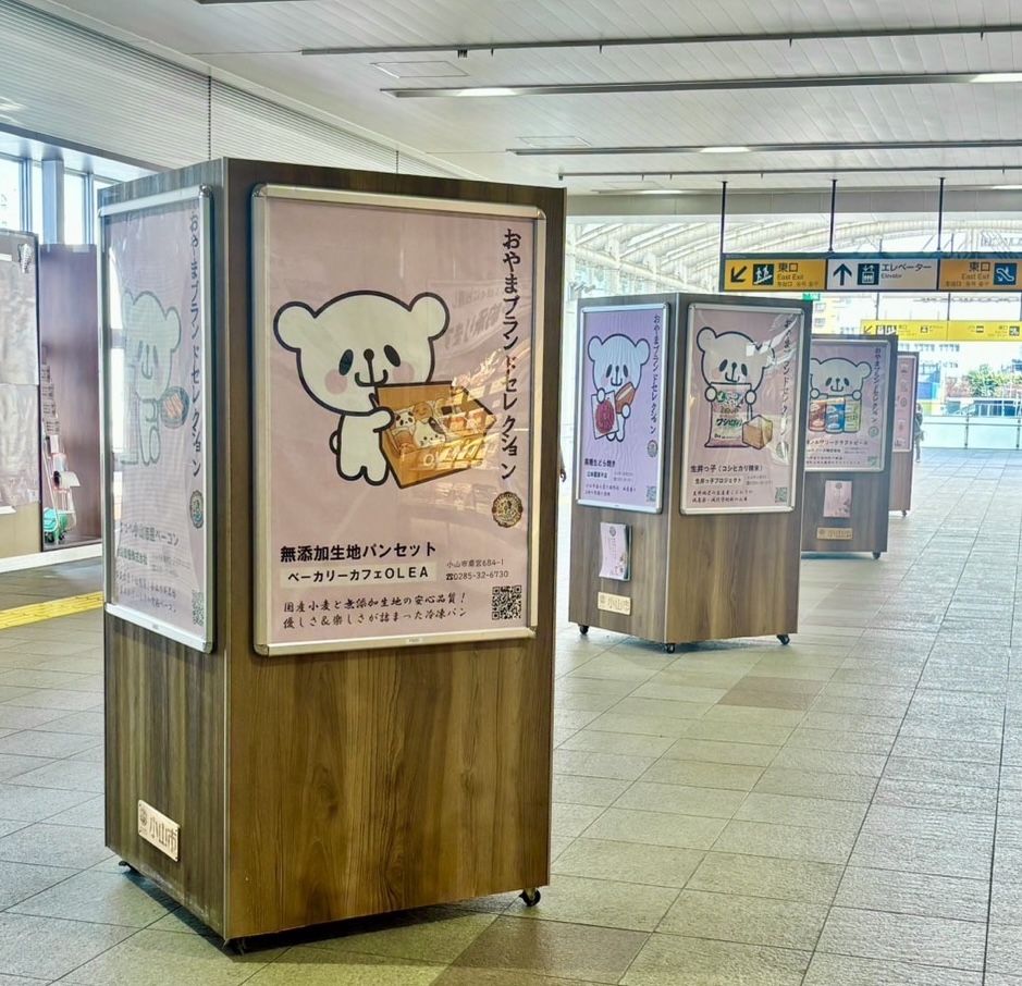 小山駅の東西を結ぶ通路「さくら道」で、「おやまブランドセレクション」と「おやまくま」がコラボしたポスターが一面に並んでいます。