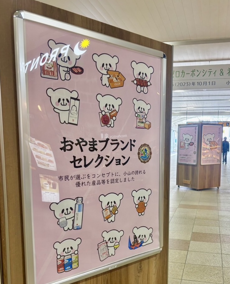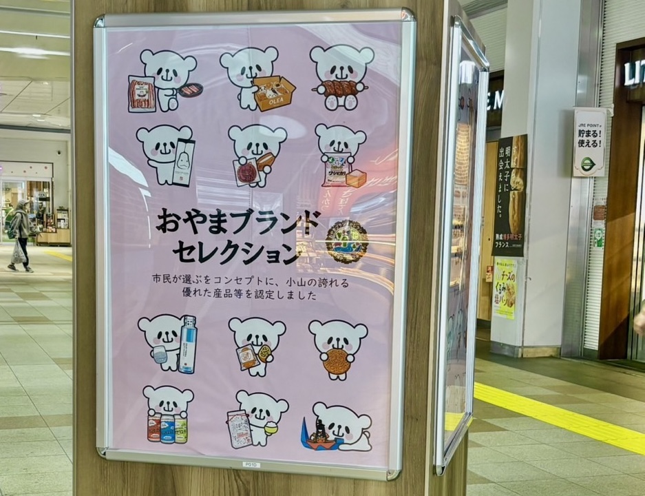駅の通路に並ぶポスターには、おやまブランドの12の認定品と「開運★おやまくま」がそれぞれコラボ。おやまくまが認定品を持っている様子がかわいらしいです。